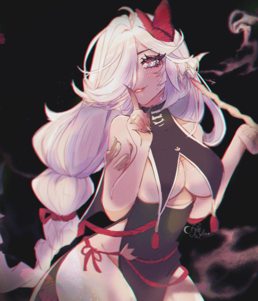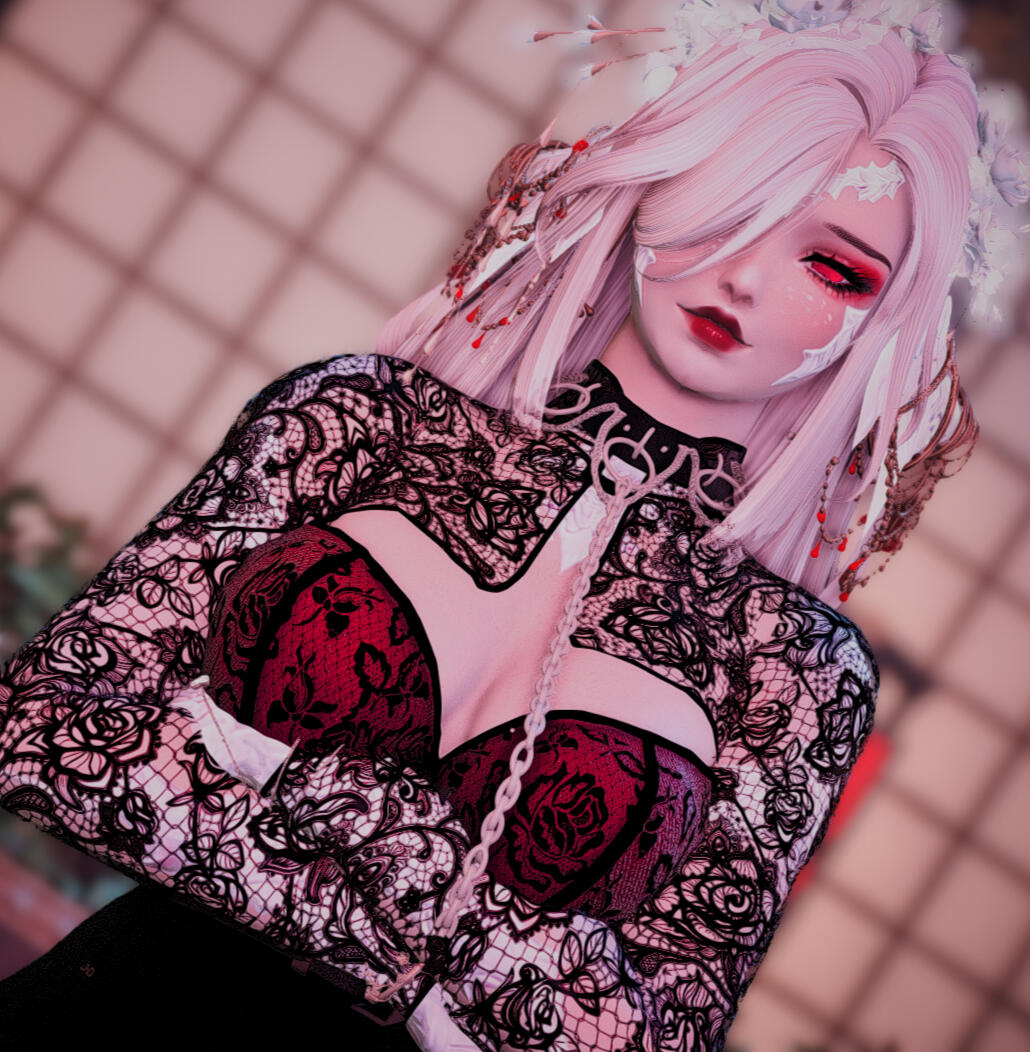 crimson, the colour of beauty and power, but bringing a certain unease whenever those curious pools of blood pierce their next victim. with half-lidded gaze, thick and glorious lashes fluttering whenever the ruby orbs, shamelessly travels up and down the body of those who might have caught her attention.mischievous, and a shameless flirt, the raen throws herself into anything which might bring her pleasure; be it alcohol, drugs, or the thrill of watching blood spill. the princess can often be found where gil and drinks are poured, either growing her father's fortune, or buying questionable substances.a woman, unafraid to follow her deepest desires, is also not ashamed to flaunt her ample, womanly curves. always seen wearing red, without fail, the front often exposes, quite a bit, of her proud bosom and some of her toned midriff. on her skin, an intoxicating scent, a blend of pheromones and other delightful mixtures, masterfully crafted to play with the minds of those within her grasp, coercing them closer, and more susceptible to her mischiefs and mind games.the vixen finds boredom a curse, and will do whatever she needs to banish it from her life, which regularly can disturb the life of those around her. she holds no qualm in using her illusions and tricks to cause chaos in the mind of unlucky men and women. the heiress often speaks of her uselessness in battle, how she is nothing more than a pretty face, but that does not mean in any way she is defenceless.once ever blue moon, the rean strips away her infamy and glamour herself -- leaving her name and status at the door to indulge a night with no chains. true freedom.